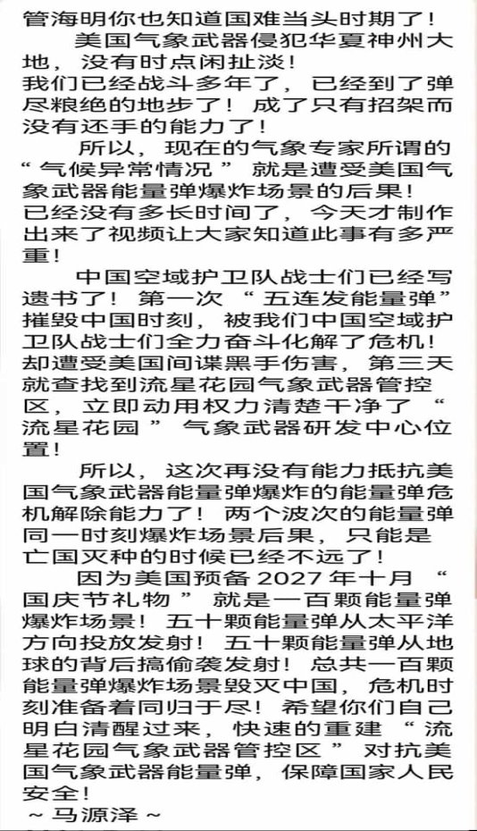 辛苦创建“流星花园”服务十多年防控美国气象武器侵犯华夏神州大地,自2014年至2023年九月27日。破解了美国气象武器能量弹“五连发”毁灭中国计划落空!仅仅三天时间,美国间谍就动作快速的摧毁了“流星花园”!现在变成了待宰的羔羊谁人知?气象学家吹牛皮说“气候异常情况将会常态化!”真实狗屁气象专家!