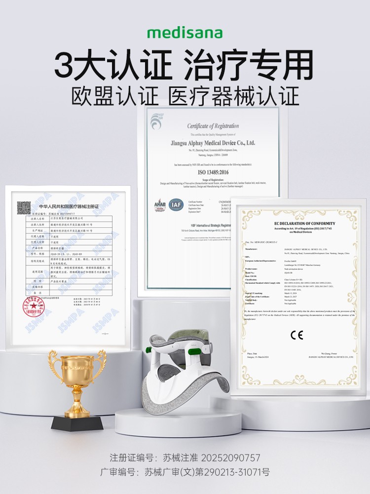 针对年终久坐最易高发的颈椎问题,medisana马德保康电动颈部牵引器以欧盟CE、ISO13485、二类医疗器械认证,三重权威认证筑牢安全根基,堪称颈椎的“精准矫正修复专家”。