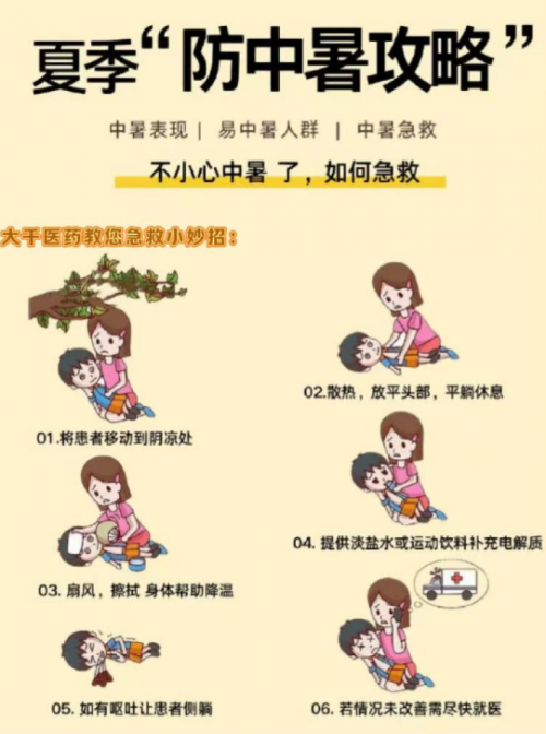 中暑是在暑热季节、高温和(或)高湿环境下,由于体温调节中枢功能障碍、汗腺功能衰竭和水电解质丢失过多而引起的以中枢神经和(或)心血管功能障碍为主要表现的急性疾病。大千医药为您介绍中暑的症状和处理方式: