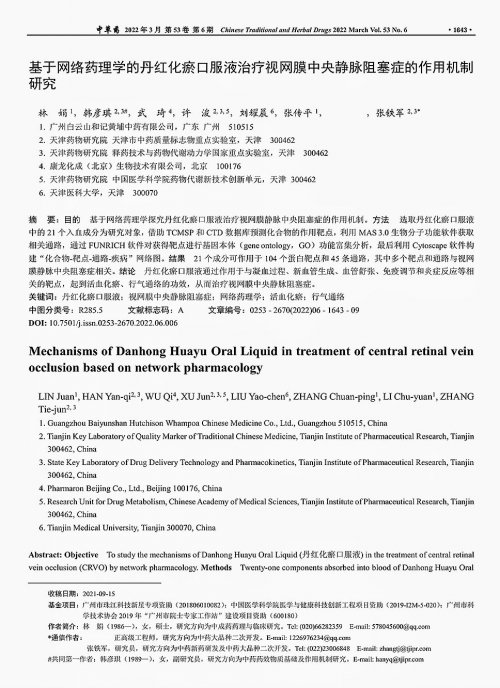 白云山和黄中药借助网络药理学、分子生物学等现代研究方法,成功构建丹红化瘀口服液 “多成分 — 多靶点 — 多通路” 的完整作用机制体系。该研究不仅明确了药物在眼科疾病中的治疗价值,更揭示其抗血小板聚集、改善血管功能的核心药理作用,为该药拓展至心脑血管疾病治疗领域提供了科学支撑,实现了中医药传统理论与现代科学内涵的有效衔接。